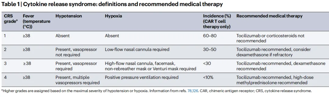 表1 | 细胞因子释放综合征:定义与推荐药物治疗: 该表根据美国移植与细胞治疗学会的共识,对CRS进行了1-4级的分级。分级依据是发热、低血压(是否需要以及需要何种血管加压药)和缺氧(需要何种给氧方式)的严重程度。表中还列出了各级CRS在CAR-T疗法中的大致发生率,并给出了相应的推荐治疗方案,核心是托珠单抗和糖皮质激素的阶梯式使用。