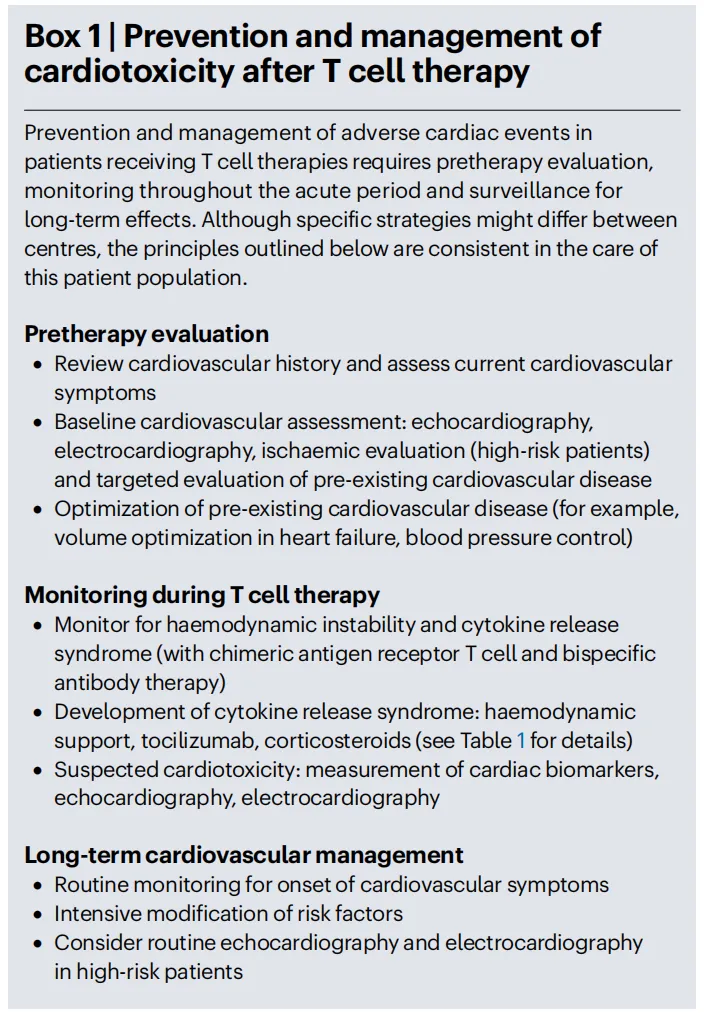 文本框1 | T细胞疗法后心脏毒性的预防和管理: 该流程图概括了从治疗前到长期随访的全程管理策略。治疗前阶段包括心血管病史评估、基线检查和优化。治疗中阶段强调监测血流动力学和CRS,并针对CRS和疑似心脏毒性进行处理。长期管理阶段则关注心血管症状监测、危险因素强化控制和影像学复查。