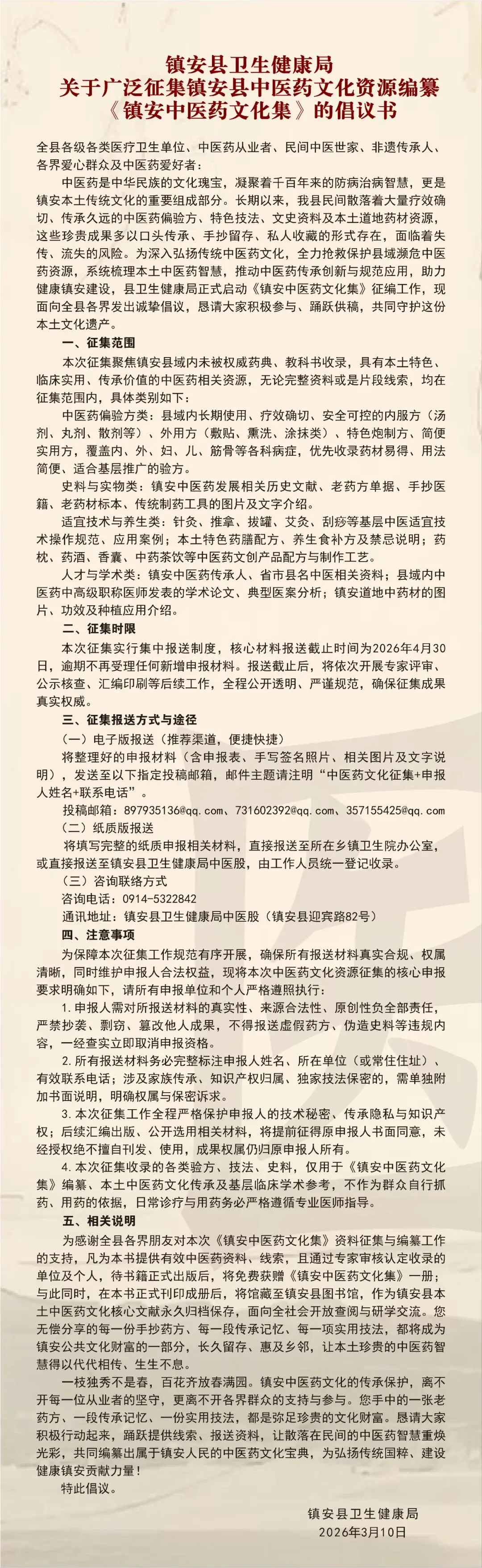 关于广泛征集镇安县中医药文化资源编纂《镇安中医药文化集》的倡议书