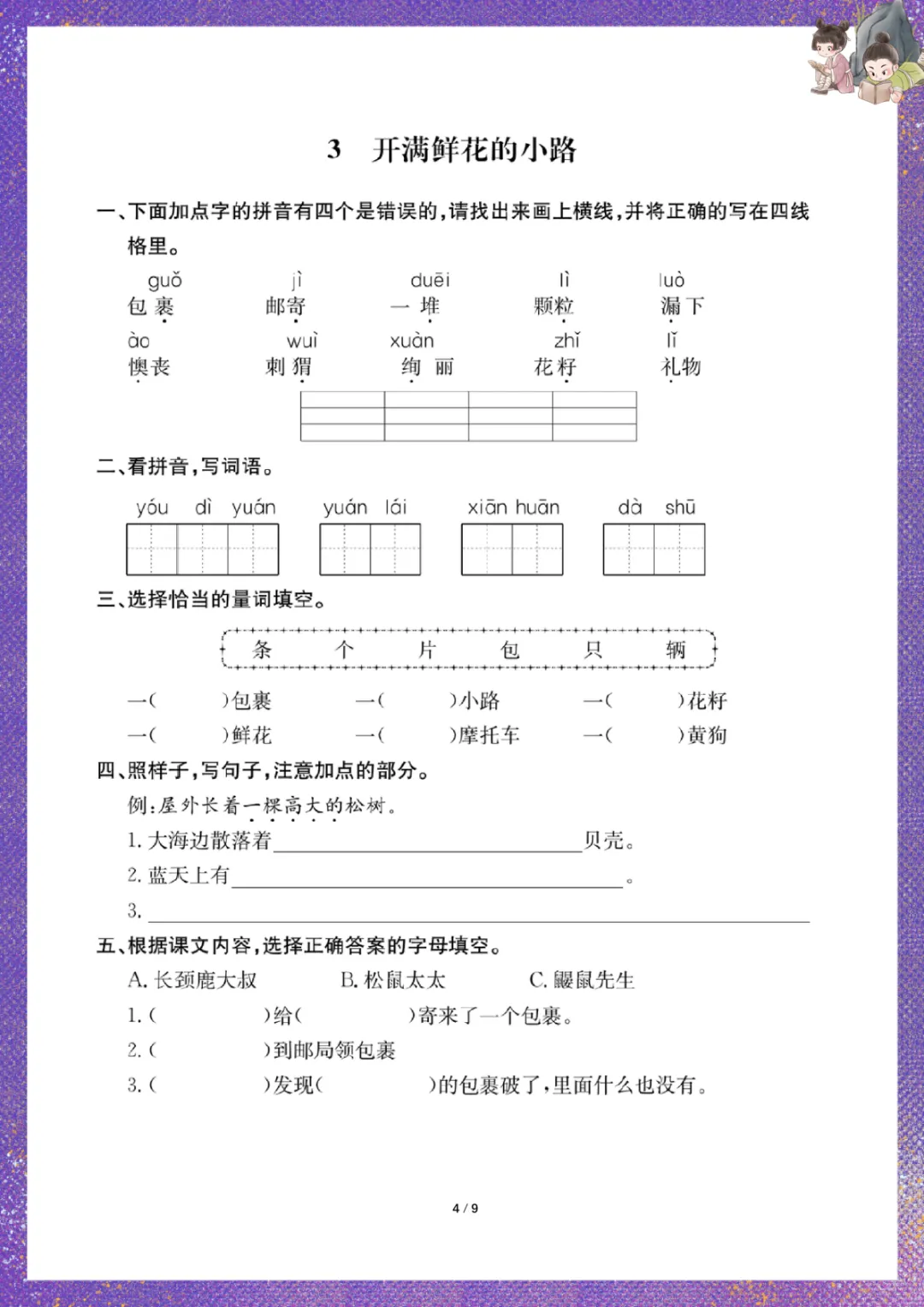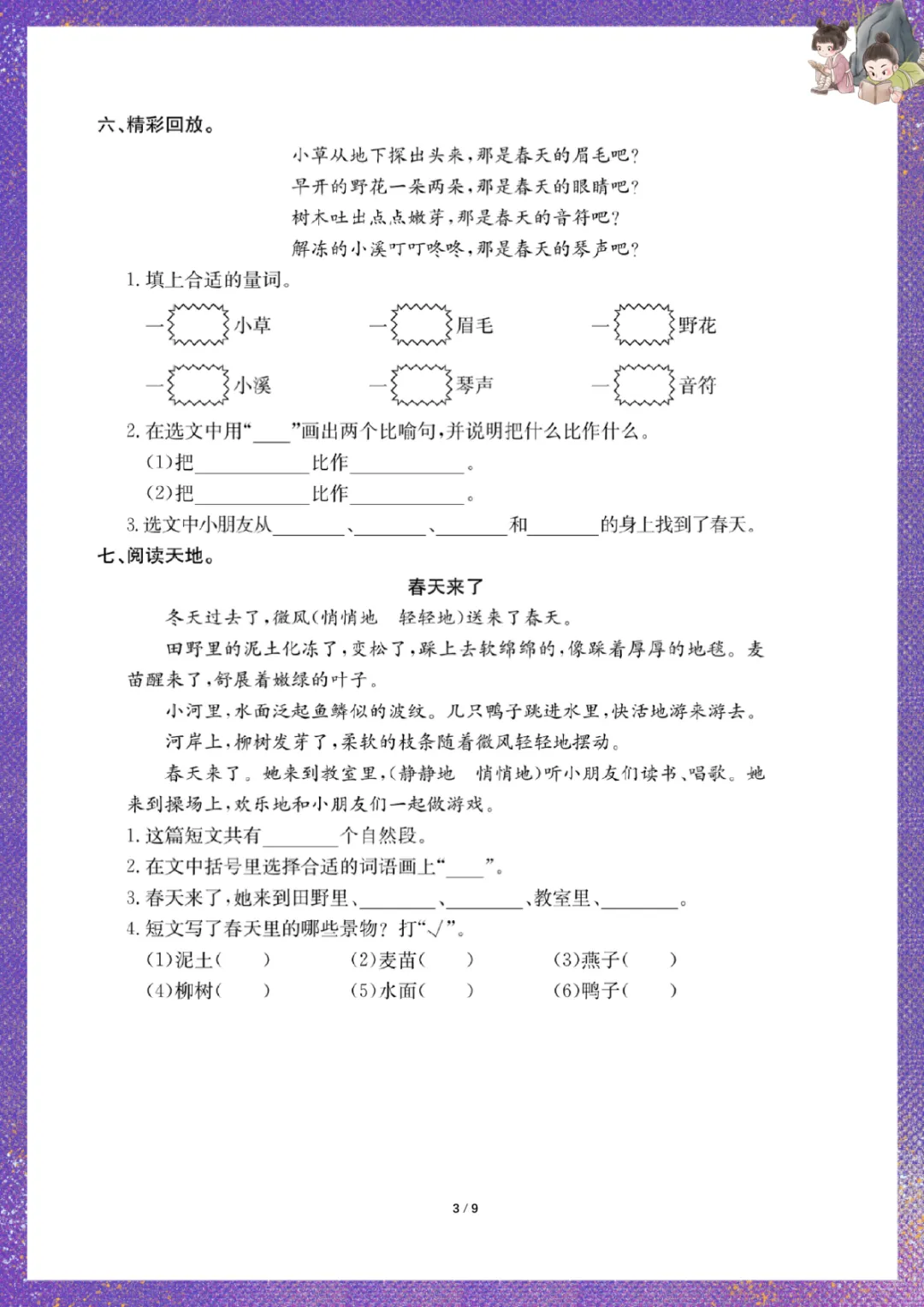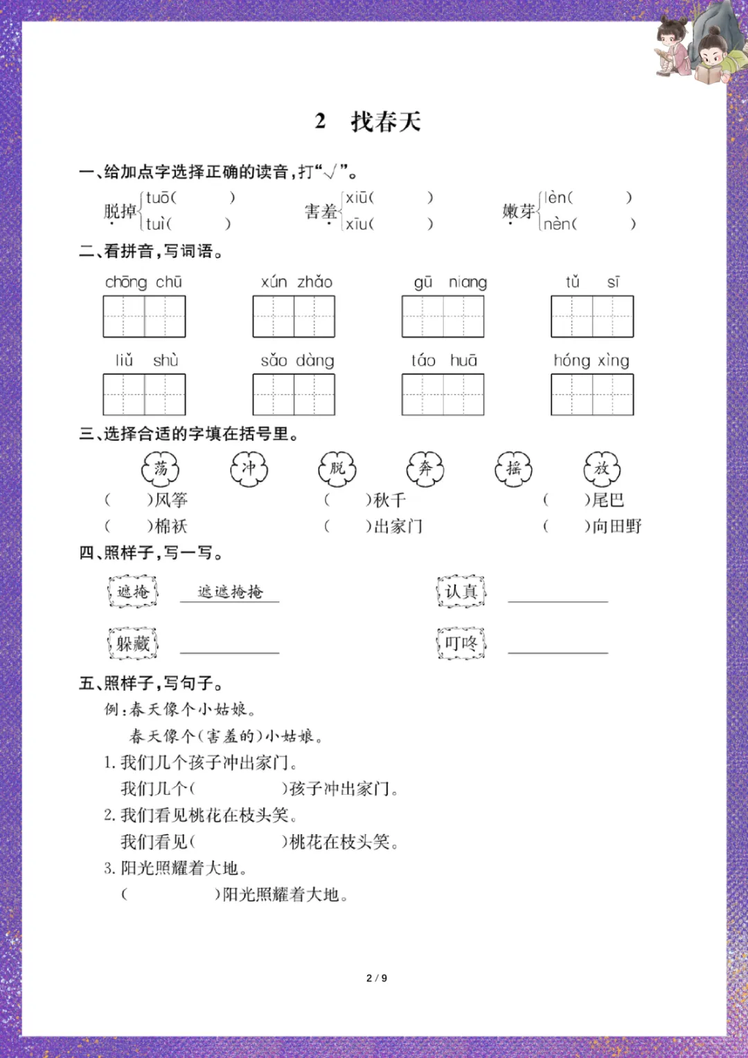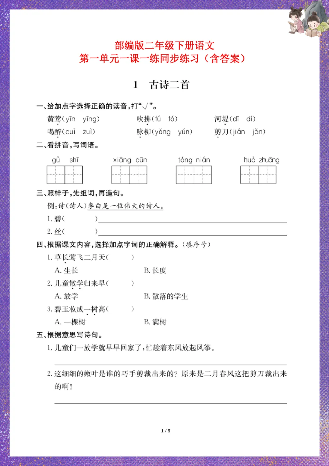 部编版二年级下册语文:第一单元一课一练同步练习(含答案)电子版可下载打印