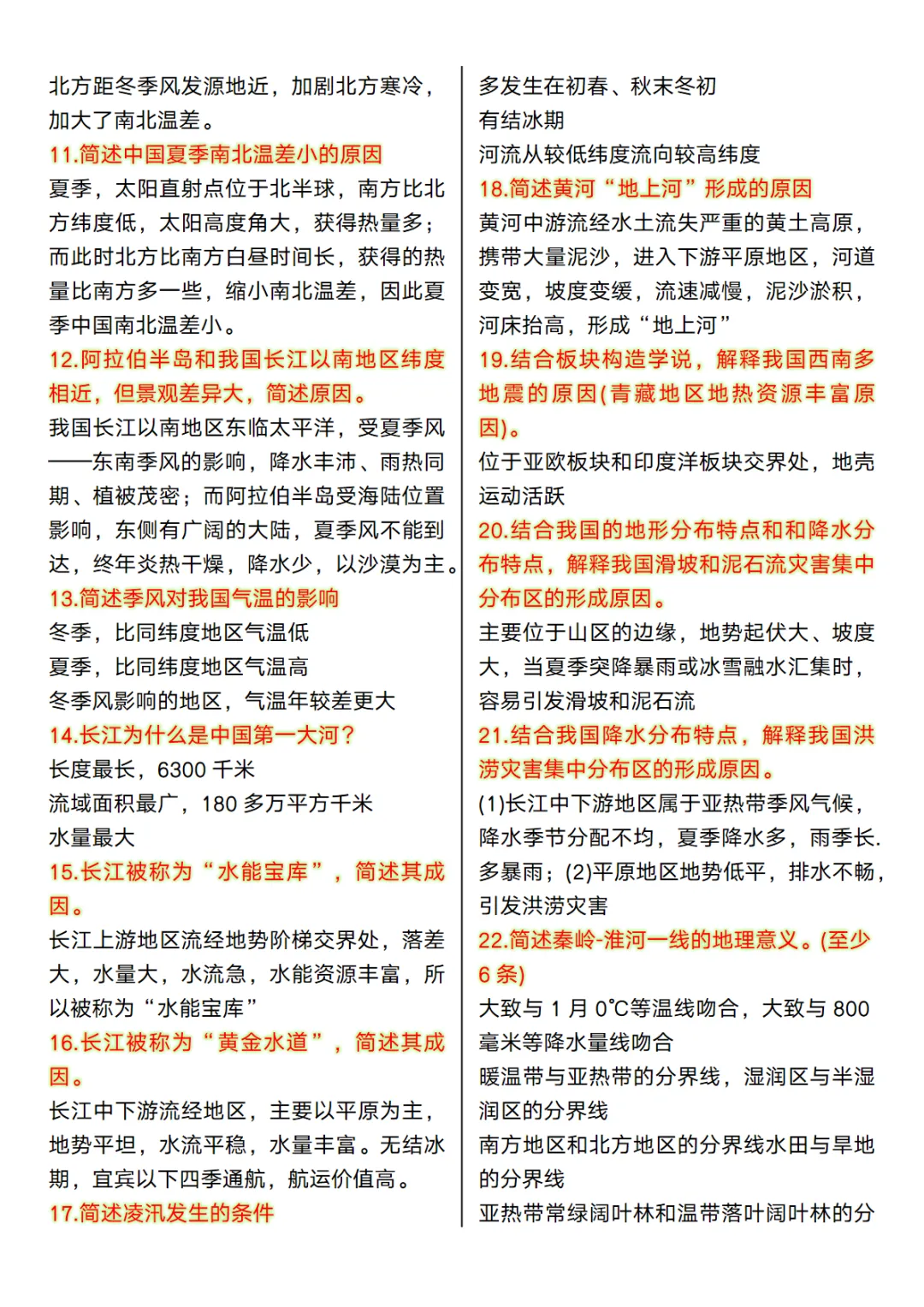 【免费下载】八年级(下)地理 初中地理常考简答题75道,PDF电子版,共7页,可打印