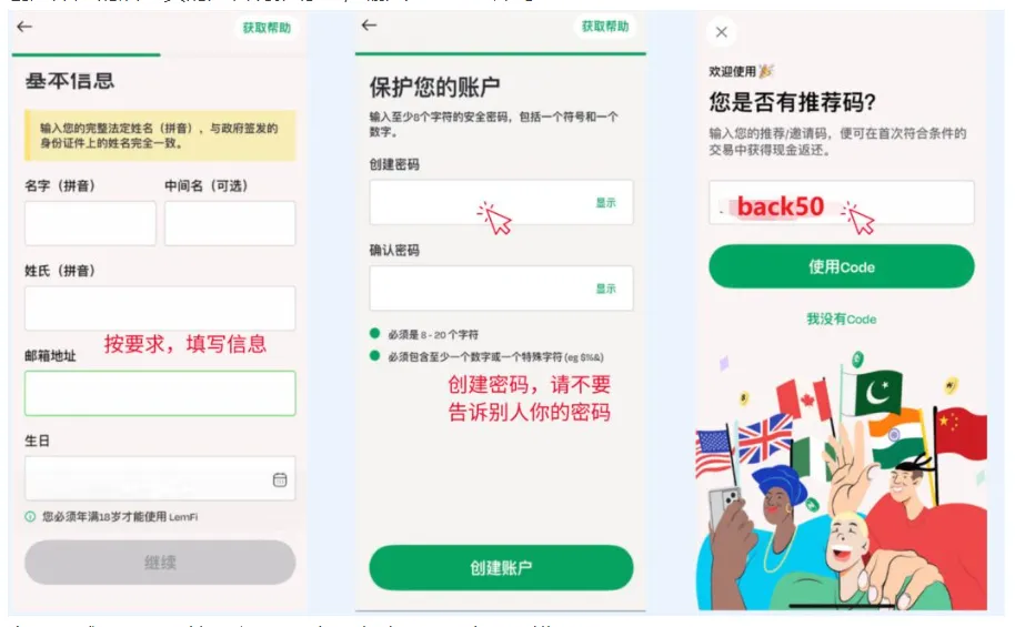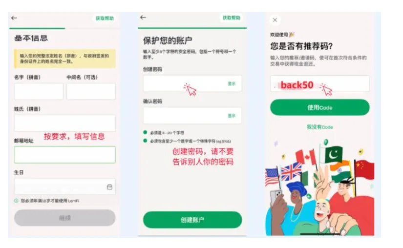 Lemfi 注册送 $50 链接(用这个链接注册或者自行下载 APP,并在 referral code 里输入 back50)