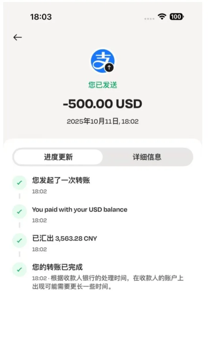 有读者试了一下,转账 $500,支付宝秒到。汇率很不错!