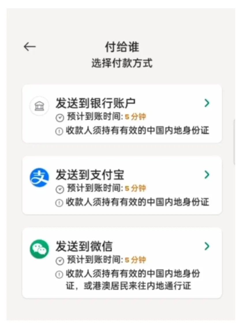 选择收款方式。我们之前介绍过微信和支付宝都是代收的,最终钱会直接进入到链接的银行账户,当然你直接选择银行账户也行。如果是第一次接受国际汇款,需要在微信和支付宝中填写一些信息,你会在收到汇款的时候自动弹出来让你填写,如实填写就行。