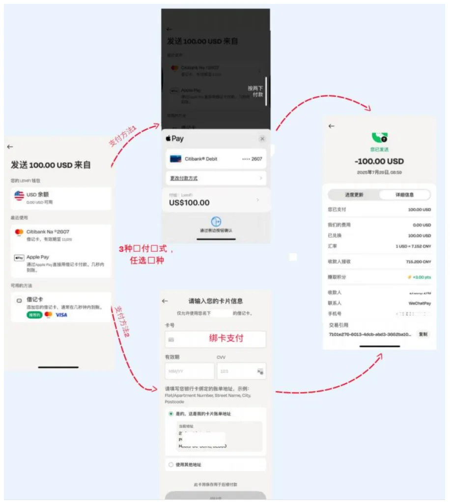 :Lemfi 可以用 debit card 存入资金,然后汇款(也可以转回银行,下面会讲),所以可以直接拿来完成一些银行要求的 debit card 消费次数,APP 里面就能搞定。直接 debit 加入账户或者 debit 加入 apple pay 就能搞定! - 美国汇美国实现 fake direct deposit