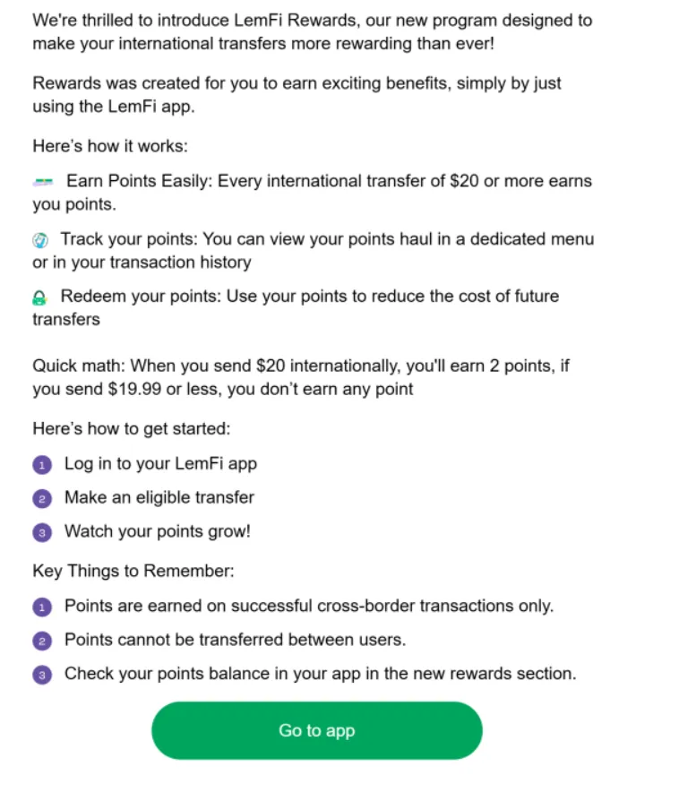 现在 Lemfi 推出了积分系统,跨国汇款 $20 以上,就可以赚取积分奖励。积分可以在汇款中兑换,未来会推出兑换 giftcard 服务。这家还在不断推出新活动,还没注册的可以赶紧加入哦,一般第一轮活动的奖励是最丰富的。