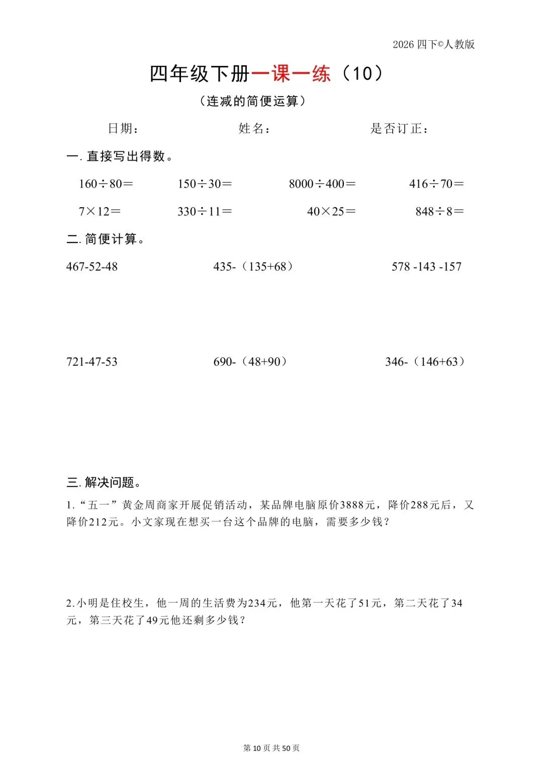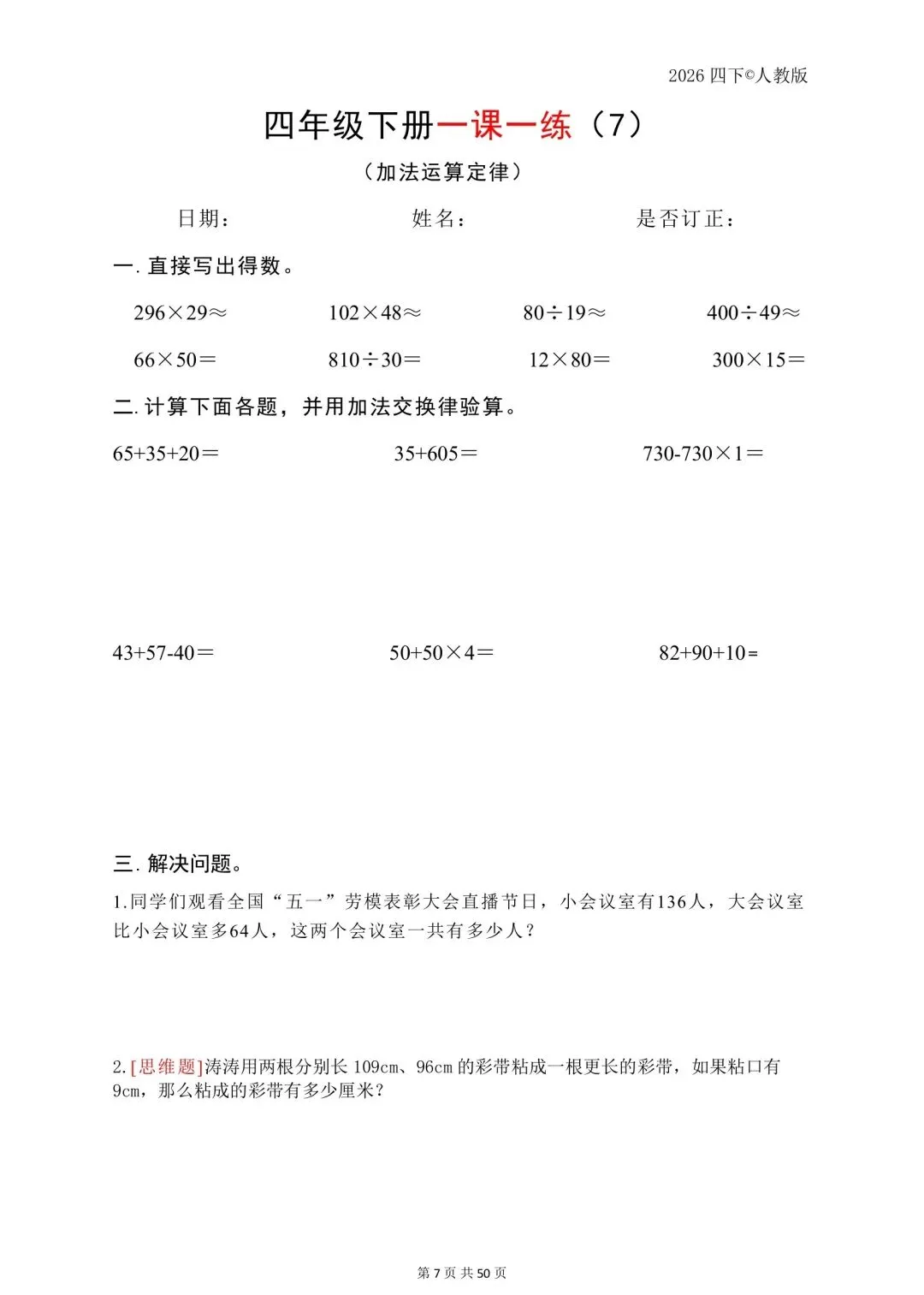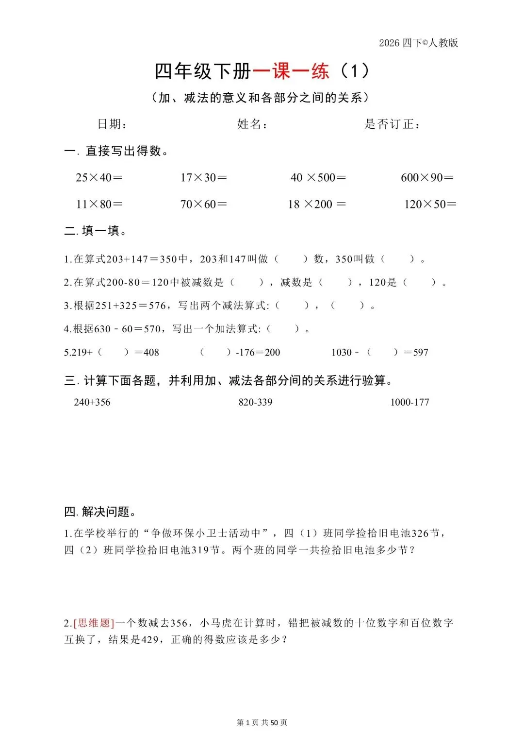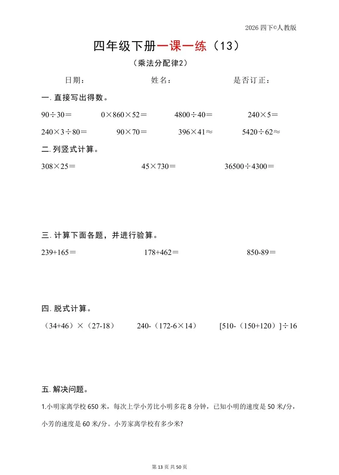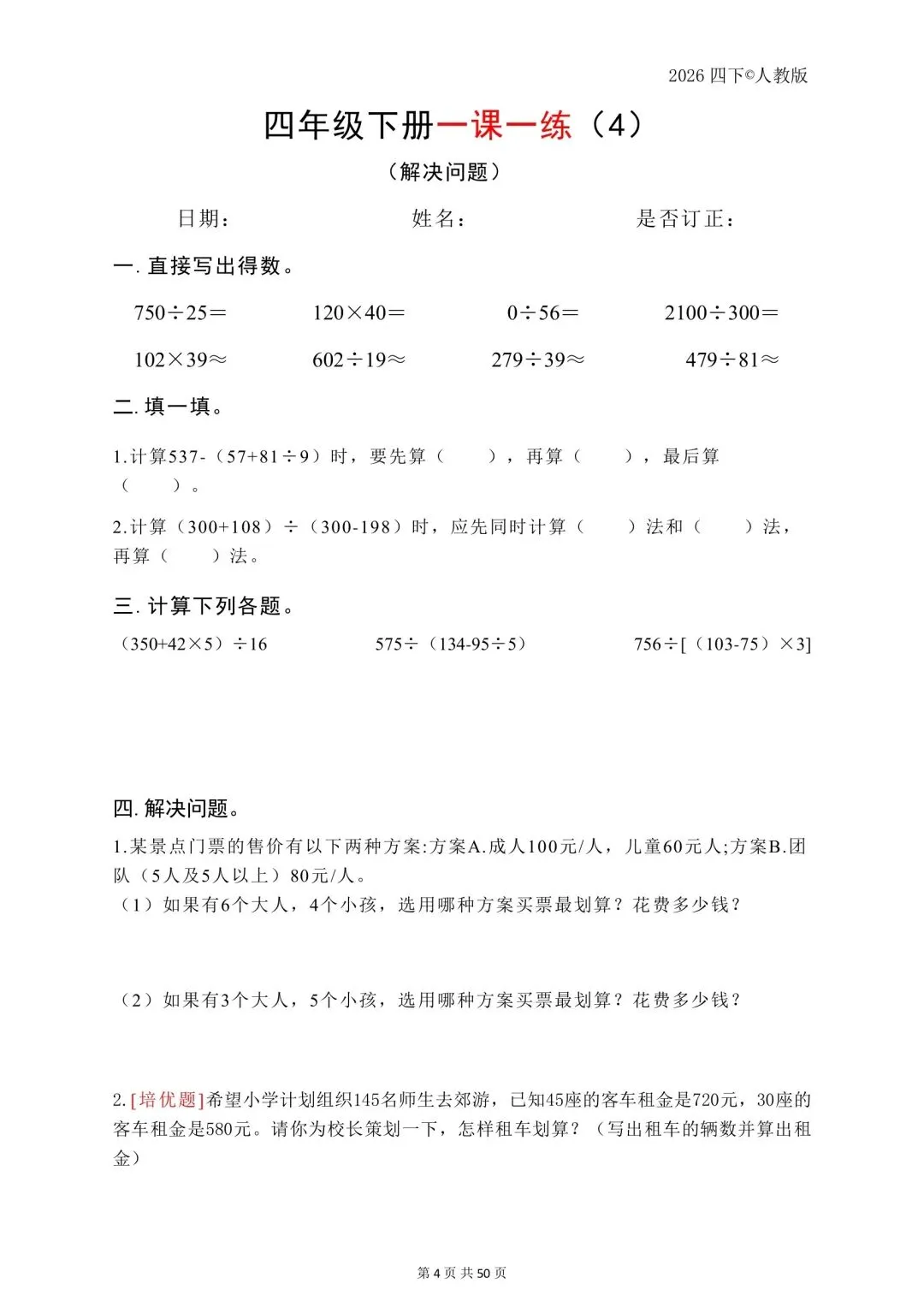 26年春四年级下数学人教版一课一练,电子版免费可打印 温馨提醒:文中仅能展示部分内容, 完整电子版领取方式在文 声明资料源于网络收集,纯分享,禁止商用,如需要请买正版 一到六年级的电子资料都有, 需要的可以点关注 领取完整电子版: 1:点一点右下角的👍和❤️ 2:在公众号对话框中回复:821可免费领取