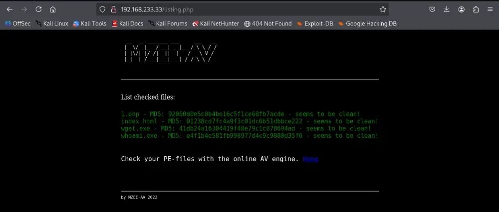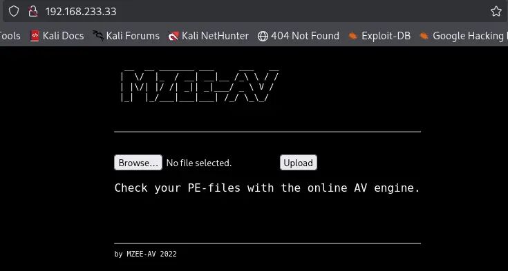 ┌──(kali㉿kali)-[~/Desktop]└─$ sudo nmap -Pn --min-rate 1000 -p22,80 -A 192.168.233.33Starting Nmap 7.95 ( https://nmap.org ) at 2026-03-05 18:05 ESTNmap scan report for localhost (192.168.233.33)Host is up (0.26s latency).PORT STATE SERVICE VERSION22/tcp open ssh OpenSSH 8.4p1 Debian 5+deb11u2 (protocol 2.0)| ssh-hostkey:| 3072 c9:c3:da:15:28:3b:f1:f8:9a:36:df:4d:36:6b:a7:44 (RSA)| 256 26:03:2b:f6:da:90:1d:1b:ec:8d:8f:8d:1e:7e:3d:6b (ECDSA)|_ 256 fb:43:b2:b0:19:2f:d3:f6:bc:aa:60:67:ab:c1:af:37 (ED25519)80/tcp open http Apache httpd 2.4.56 ((Debian))|_http-title: MZEE-AV - Check your files|_http-server-header: Apache/2.4.56 (Debian)Warning: OSScan results may be unreliable because we could not find at least 1 open and 1 closed portDevice type: general purpose|routerRunning: Linux 4.X|5.X, MikroTik RouterOS 7.XOS CPE: cpe:/o:linux:linux_kernel:4 cpe:/o:linux:linux_kernel:5 cpe:/o:mikrotik:routeros:7 cpe:/o:linux:linux_kernel:5.6.3OS details: Linux 4.15 - 5.19, Linux 5.0 - 5.14, MikroTik RouterOS 7.2 - 7.5 (Linux 5.6.3)Network Distance: 4 hopsService Info: OS: Linux; CPE: cpe:/o:linux:linux_kernelTRACEROUTE (using port 22/tcp)HOP RTT ADDRESS1 264.16 ms localhost (192.168.45.1)2 264.10 ms bogon (192.168.45.254)3 264.19 ms bogon (192.168.251.1)4 264.32 ms localhost (192.168.233.33)OS and Service detection performed. Please report any incorrect results at https://nmap.org/submit/ .Nmap done: 1 IP address (1 host up) scanned in 18.90 seconds