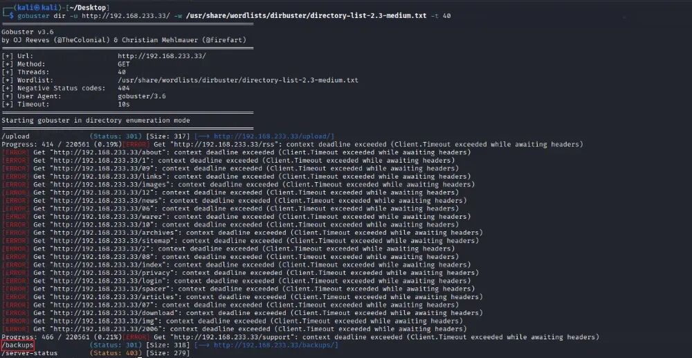 gobuster dir -u http://192.168.233.33/ -w /usr/share/wordlists/dirbuster/directory-list-2.3-medium.txt -t 40