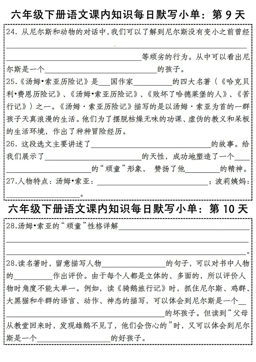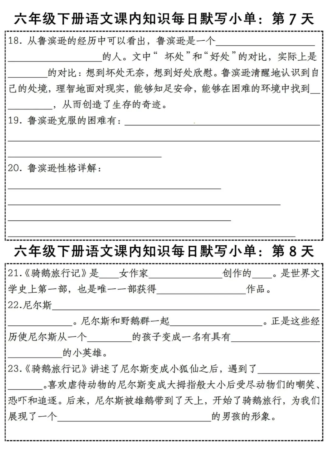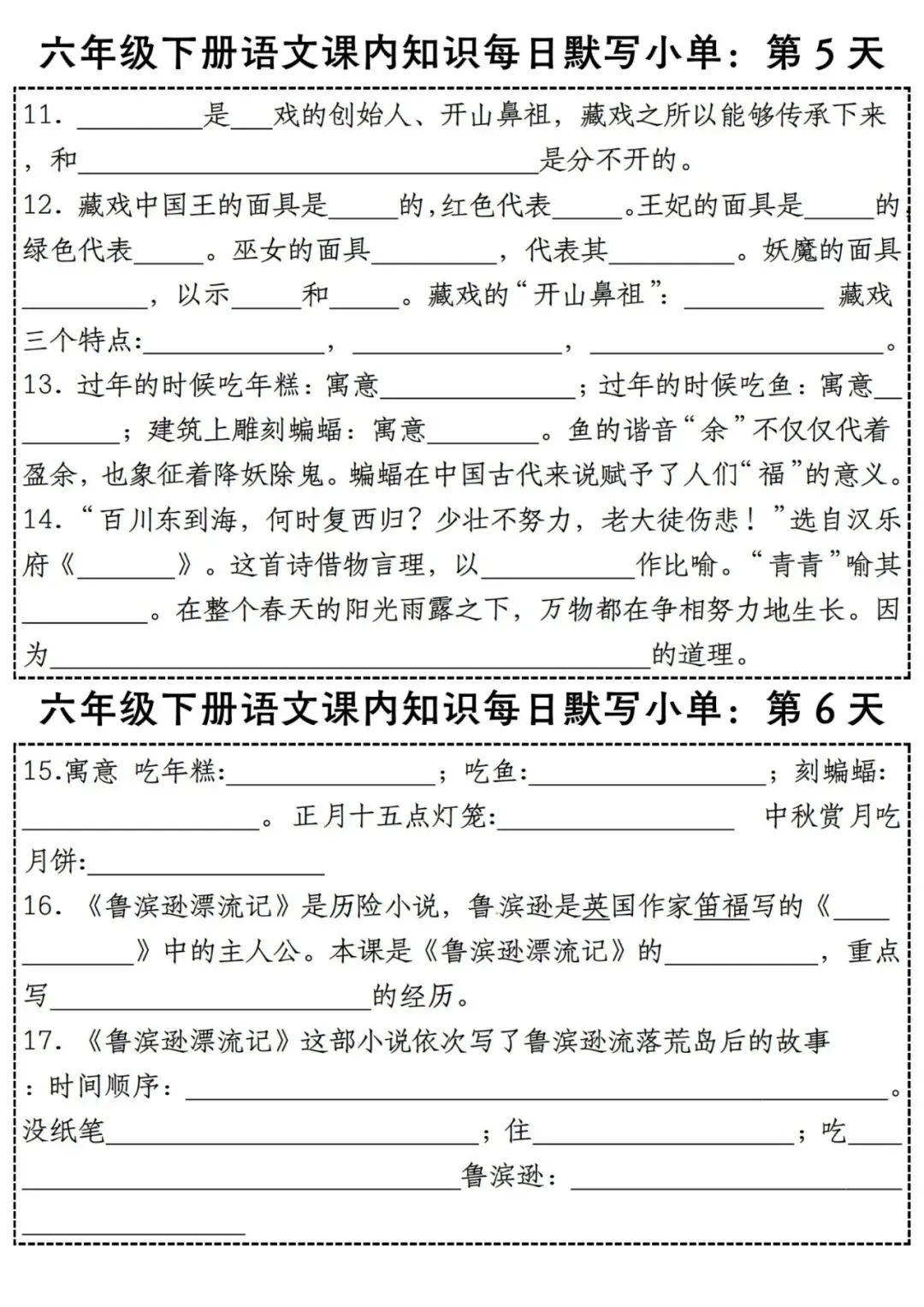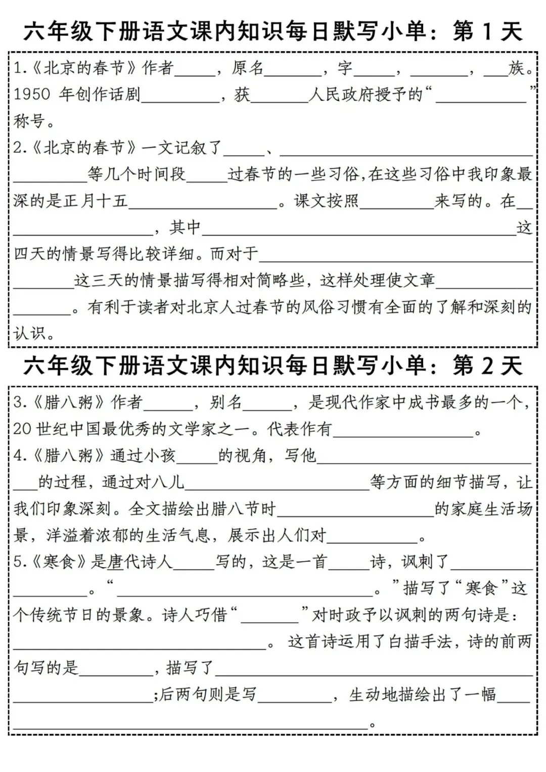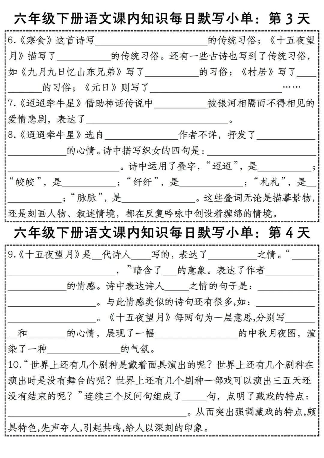 【默写小单】六年级下册每日课内知识练习,可下载!