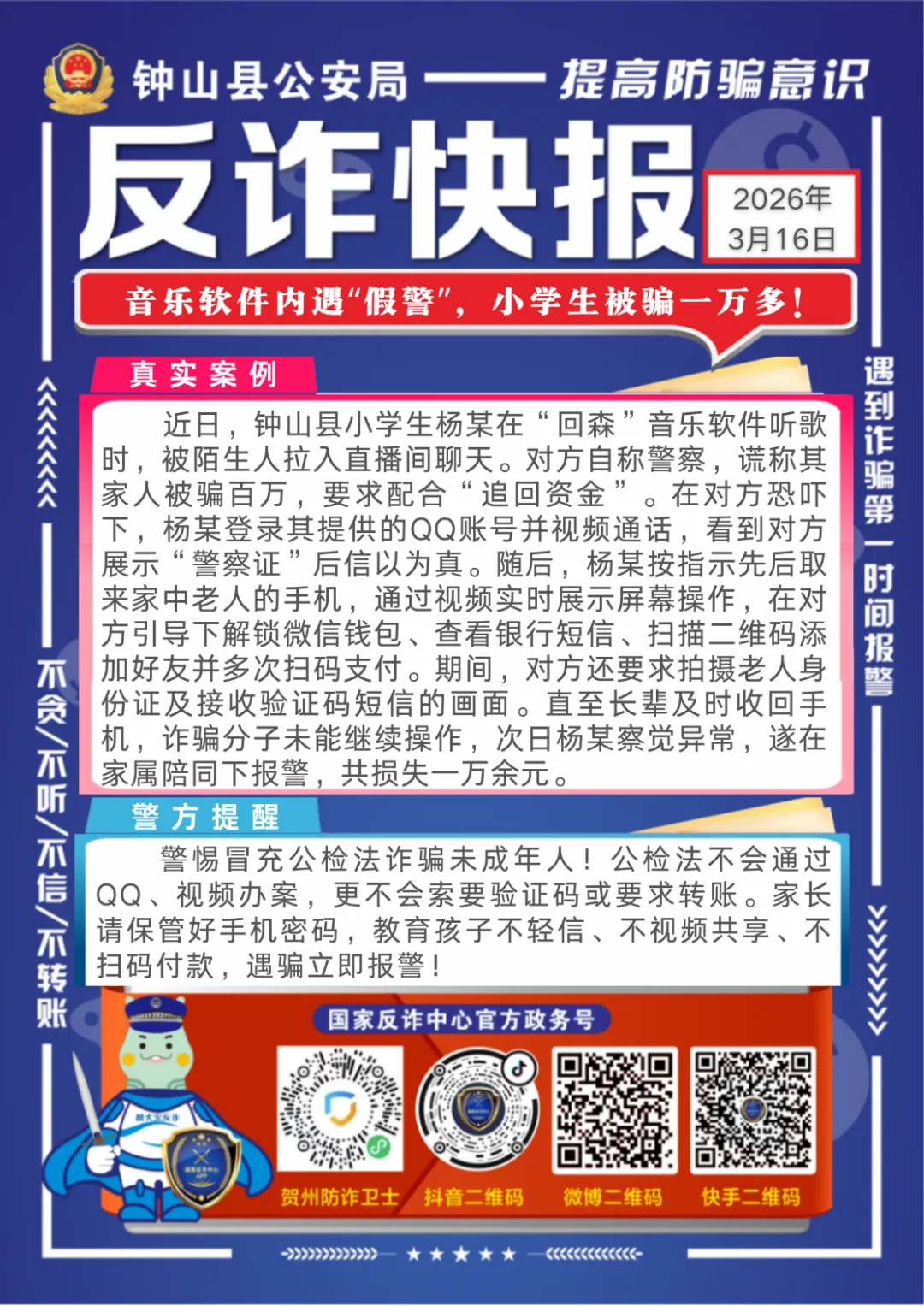 【反诈进行时·科普专栏】音乐软件内遇“假警”,小学生被骗一万多!