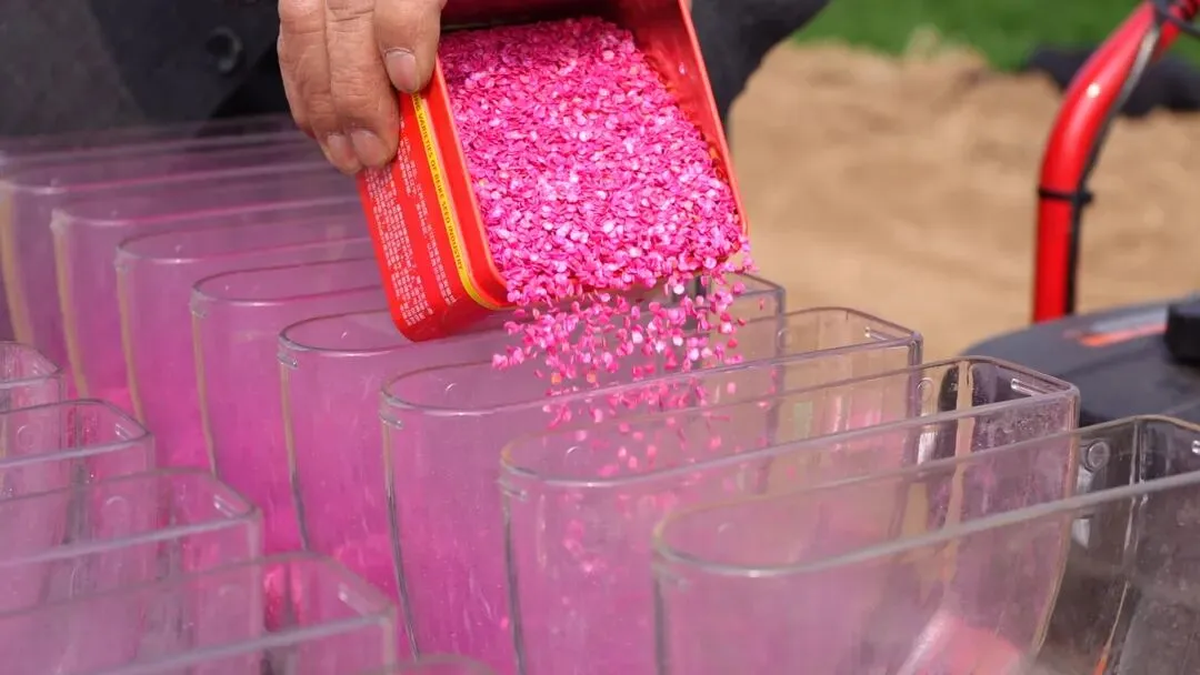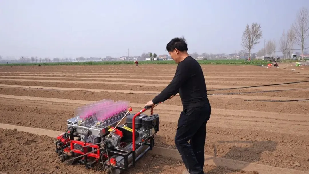 整地环节一气呵成后,辣椒育苗的“主角”——Rw-650型辣椒蔬菜育苗播种机正式登场。这台外形干练的机械被牵引至地头,随着机器启动,它沿着菜畦匀速前行,身后便精准地完成了一道道工序:开沟、播种、覆土、镇压……辣椒种子被均匀播撒进土壤,深浅一致,行距整齐。令人惊叹的是,这条110米的超长菜畦,播种机一个来回仅用 5分钟就全部播完。