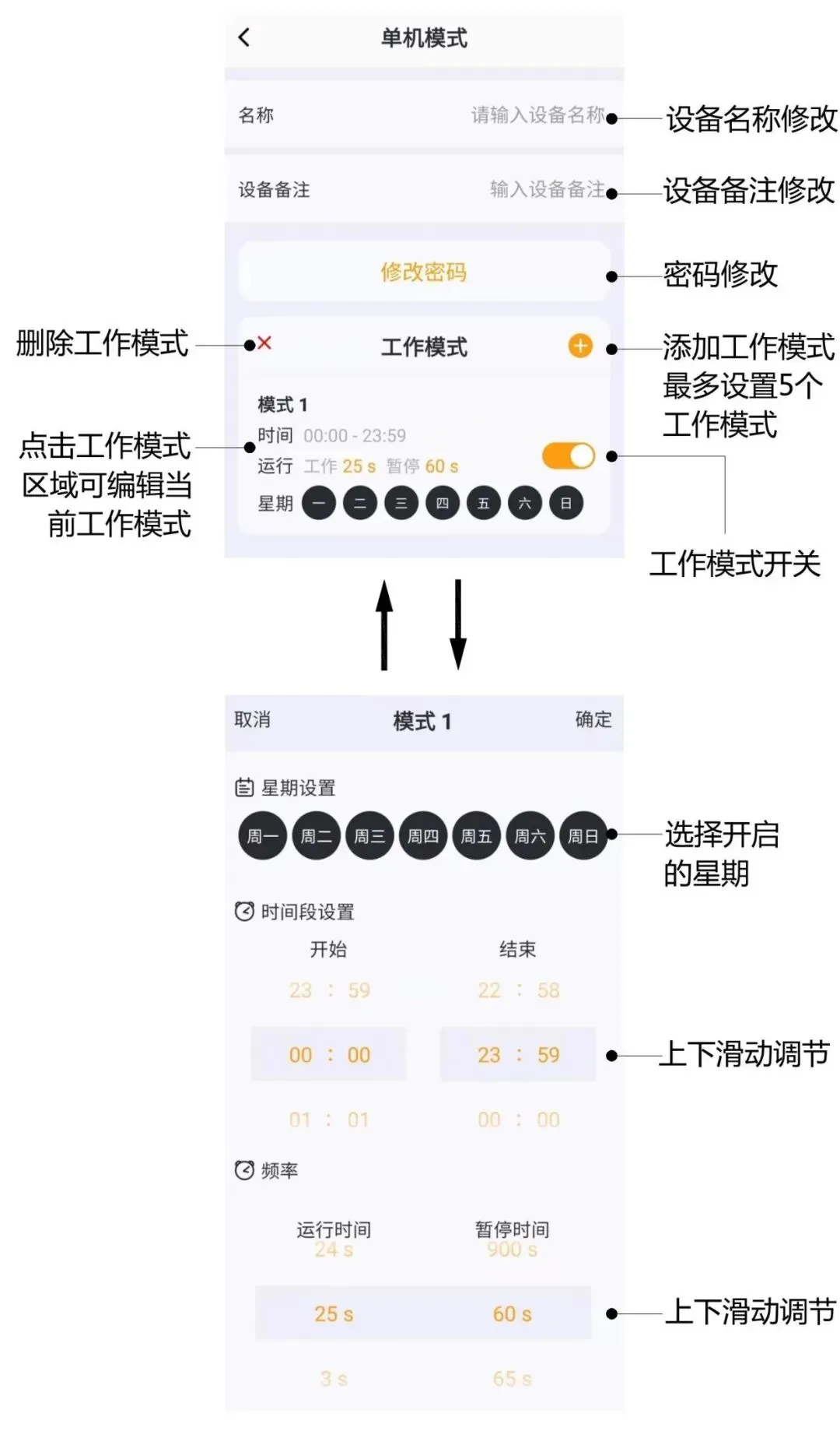 定时间: 上下滑动调节每天开始和结束的时间。