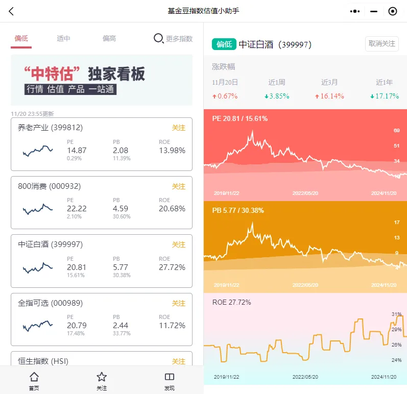基金豆平台做的指数工具,把市盈率,市净率,净资产收益率都放在同一个时间线上,你可以跟直观的对照行业基本面和止盈率之间的对应关系。