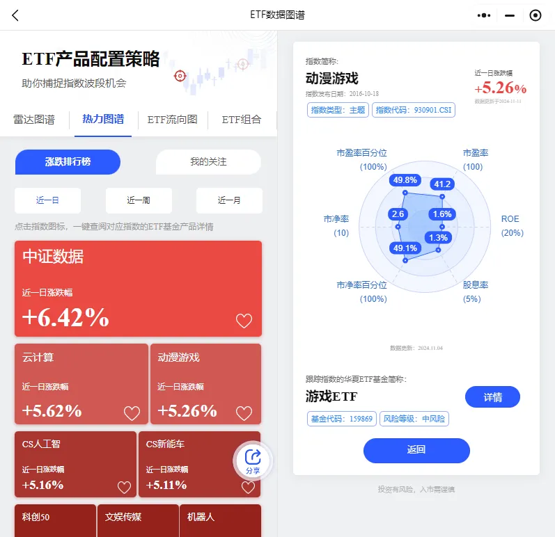 ETF数据图谱当中做了ETF雷达图谱,把华夏基金的ETF谱系做了详细的介绍,并且对应具体的行业,方便基民选择。指数热力图中还给每个指数做了蛛网图,你可以直观看到每个指数的基本面,估值水平。