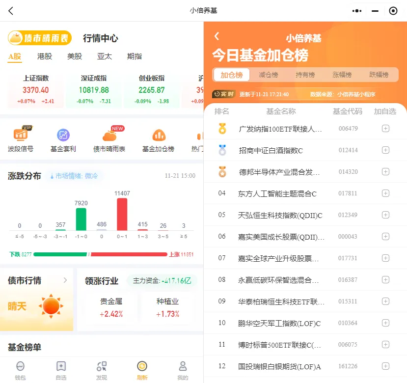小倍养基的整体风格是比较小清新的,基金加仓榜其实是从市场上抓取各种基金数据来做排序,这些数据散落在天天基金,蚂蚁财富,腾讯理财通,京东金融等平台,你根据这些热搜数据,或者实时的交易数据,能看到别的基民都在买什么基金。也算是一个参考吧。