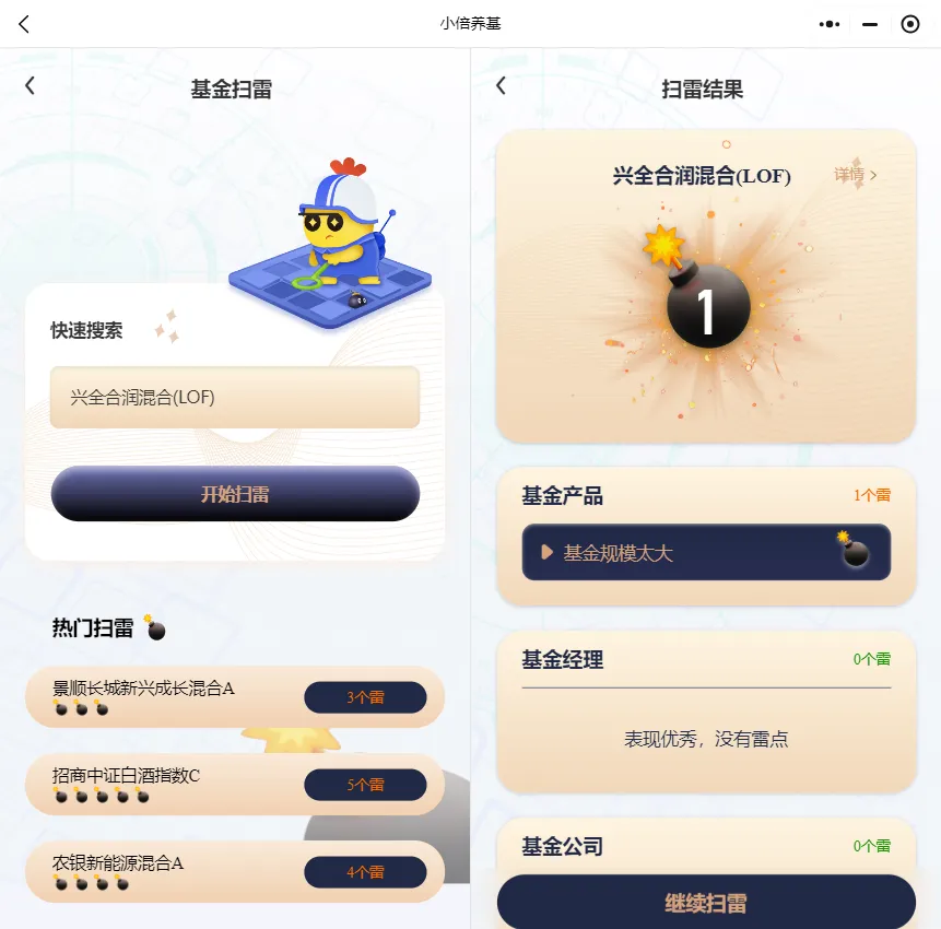 这基金扫雷功能,一般的做工具的公司,都不愿意做,大家都不想引发负面舆情,毕竟,如果基金没有真的踩雷,你去帮人家扫雷,是吃力不讨好的事情。