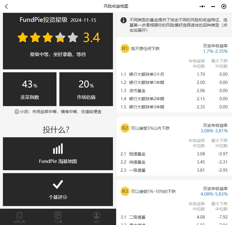 这个淘基地图做得非常简单,但是我觉得非常重要。很多基民亏钱都是因为买了不合适的产品。淘基地图做了一个详细的分类,把用户分成5类,每一类用户适合购买的产品的历史收益,最大回撤都给你标注出来,你买的时候就可以对照看看,是不是愿意承受主要的风险,能接受你再买。
