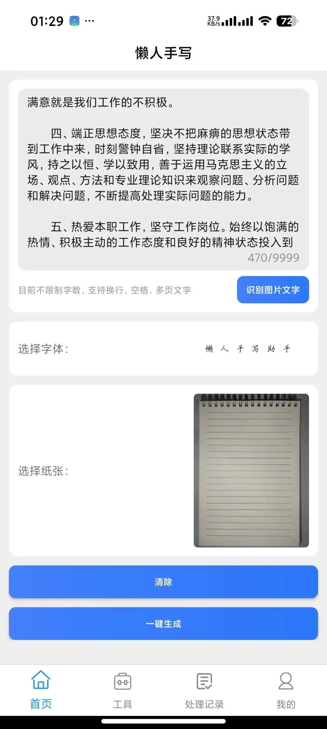 第一项核心功能就是懒人手写生成,也是软件的主打亮点,能够高度模拟真实手写字体,直接输入文字就能生成手写效果,完美替代手动抄写,再也不用熬夜抄笔记、写作业、填手写报告,字迹自然不生硬,完全看不出是软件生成,懒人解放双手的核心利器。