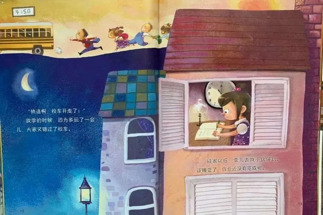 快追啊,校车开走了!”放学的时候,因为多玩了一会,大家又错过了校车。回家以后,幸儿去找小伙伴玩。该睡觉了,作业还没有完成呢。