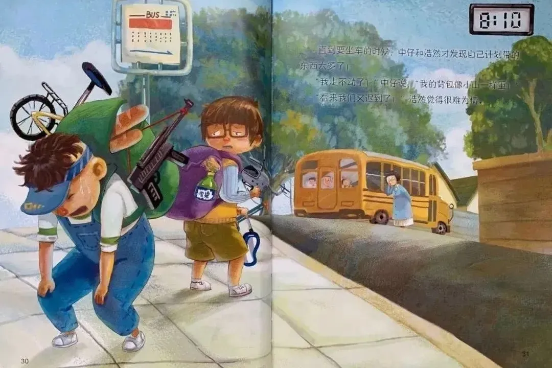 直到要坐车的时候,中仔和浩然才发现自己计划带的东西太多了!“我走不动了!”中仔说,“我的背包像小山一样重!”“看来我们又迟到了!”浩然觉得很难为情。