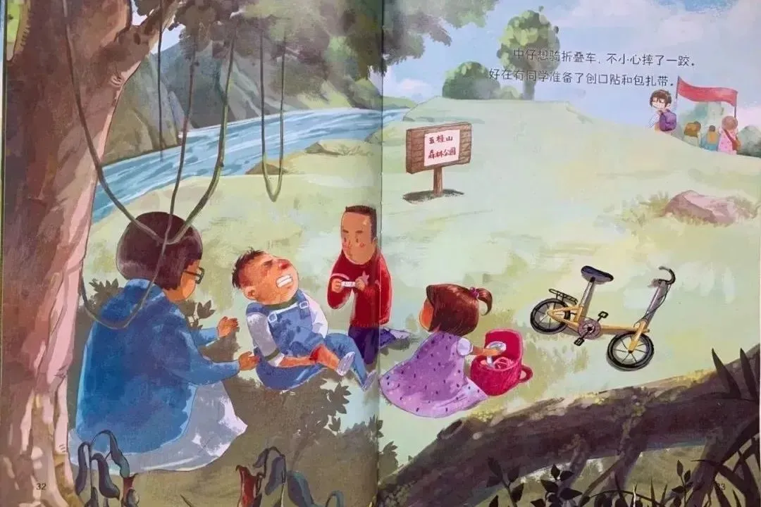 中仔想骑折叠车,不小心摔了一跤。好在有同学准备了创可贴和包扎带。