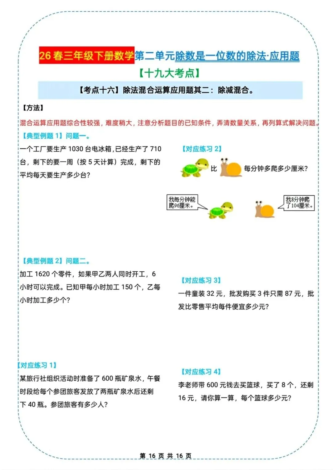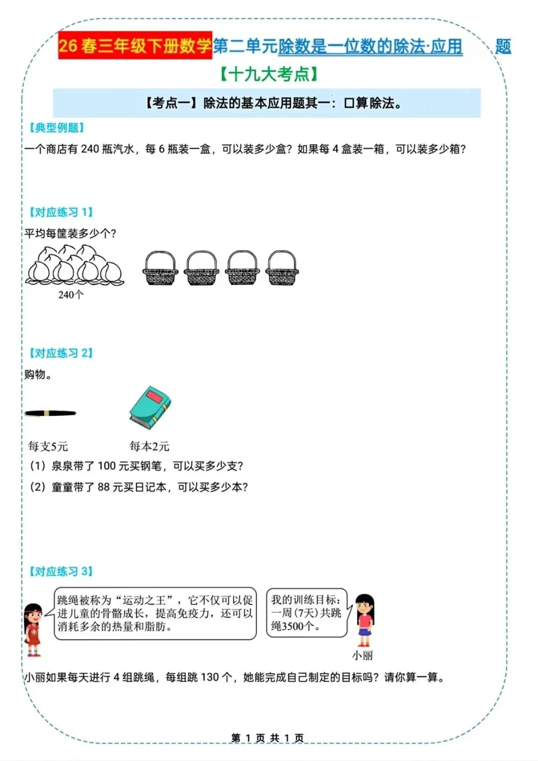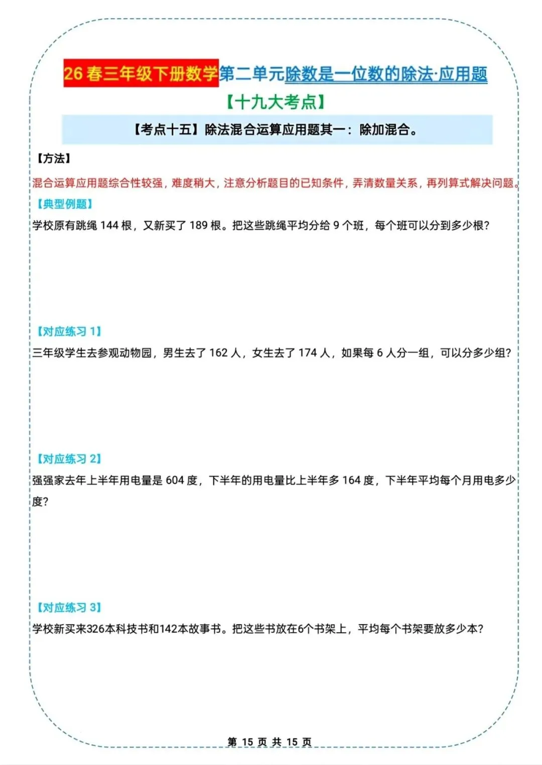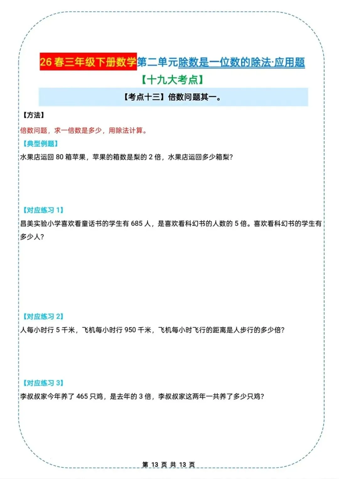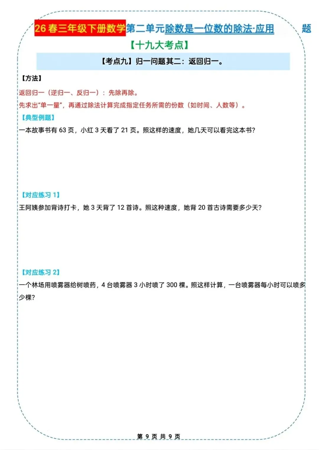 🌟2026春三年级下册通用版数学,除数是一位数的除法|应用题十九大考点专项练习,需要的家长朋友抓紧领回去,给孩子练起来吧💪!