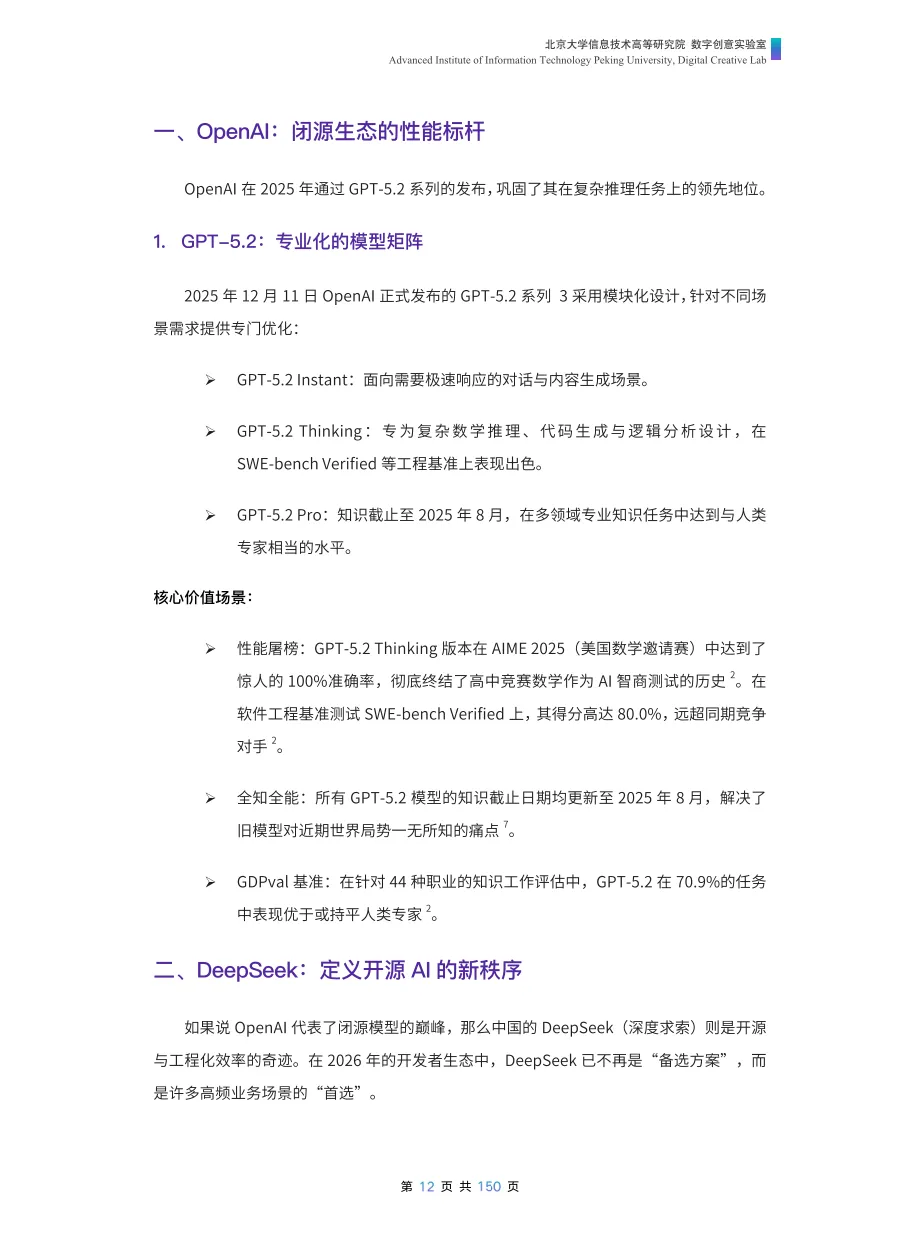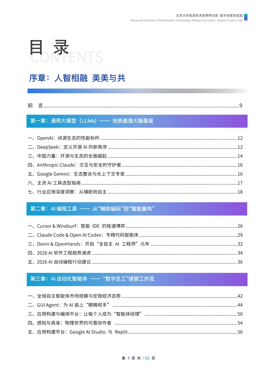 ·《AI工具全景指南》覆盖通用大模型、AI编程、自动化智能体、创意工具、科研工具、垂直生产力工具六大核心板块,解析OpenAI、DeepSeek等顶尖工具的技术优势与应用场景,核心展现2026年AI从“辅助工具”向“数字员工”的范式跃迁,突出多智能体协作、垂直领域深耕、开源与闭源生态共生等趋势。