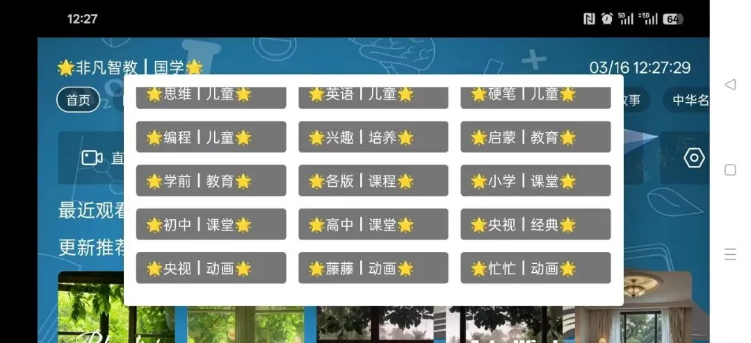 1、新发现的一个顶级哄娃神器,大屏电视和安卓手机都可用,可以适配全年龄阶段,从儿童启蒙到幼儿园,小学,初中,高中全套学习资源,每年起码省大几百。点击左上角首页可以切换不同分类,可以看到各种阶段类型都有。软件获取见文章末尾!!
