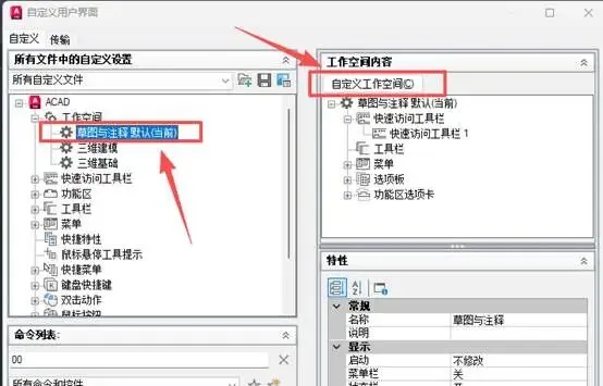 11.滑到最上面,点工作空间中的草图与注释默认(当前),然后点自定义工作空间