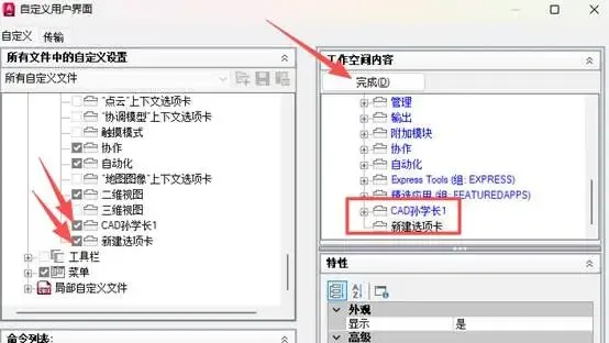 12.然后左边会出现复选框,选中5中新建选项卡前面的方框,在右边点完成,