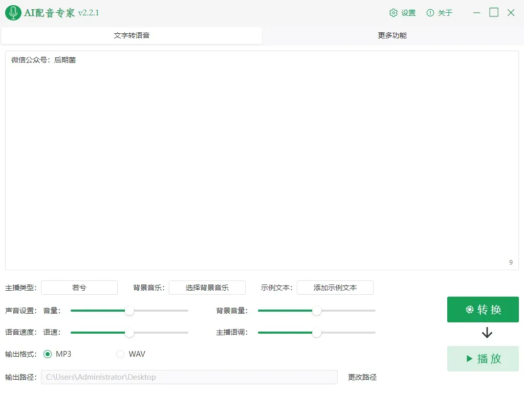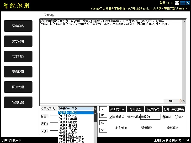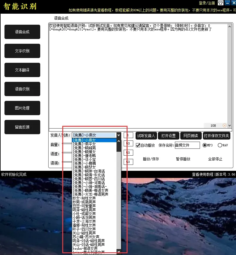 本款文字转语音工具,优点:发音种类多目前共包含100种+发音,无需安装直接解压就可使用,缺点:仅支持WIN系统,且只有小部分免费,其余需要付费才能使用;