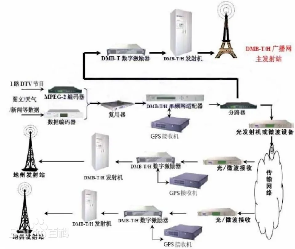 然后每家每户都可以用dtmb接收器接收这个无线电信号,传入我们电视,电视里面再解码出各电台,这样我们就可以看到新闻了。