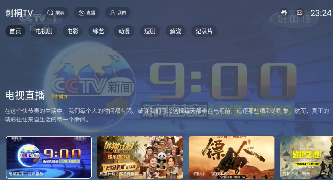 这就是打开后的主界面,里面可以选到直播选项,可以直接看新闻,还能选台,其他就是看影视电视剧等待。总的来说功能还是挺齐全的。