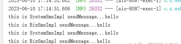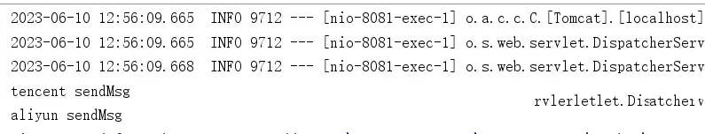 启动工程代码后,调用接口:localhost:8081/sendMsg,在控制台中可以看到下面的输出信息,即通过这种方式也可以实现类似serviceloader的方式,不过在实际使用时,可以结合配置参数进行灵活的控制;