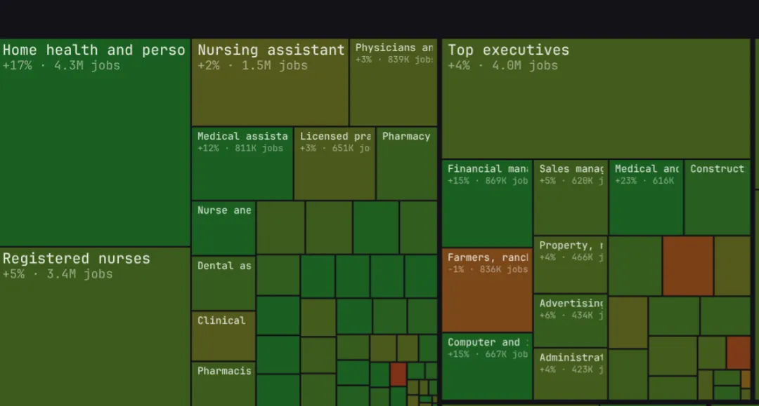 该工具基于美国劳工统计局数据,以矩形树图形式可视化342个职业、约1.43亿岗位的分布情况。用户可切换查看职业增长前景、中位数薪资、教育要求及AI暴露度等维度,并支持自定义LLM提示词进行灵活分析。数据显示68%岗位处于增长状态,高学历与高薪职业增长前景更佳。