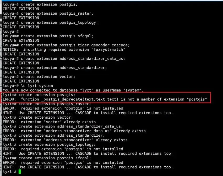 金仓for鲲鹏arm的postgis插件报错:function _postgis_deprecate(text,text,text) is not member of "postgis" 鲲鹏arm下金仓for oracle版pg模式,创建postgis插件报错: 原因是库中已存在从pg导入到金仓oracle版for pg数据库模式的对象,说明由兼容性问题。 如果创建一个空库,再创建postgis插件扩展则正常。在此基础上再重新导库操作,失败的对象问题则由开发人员调测即可。 本次测试的情况: ARM架构金仓数据库安装postgis和vector插件 鲲鹏欧拉系统创建postgis扩展报错postgis_raster-3.so”: liblber-2.4.so.2: cannot open shared object file: No such file or directory
