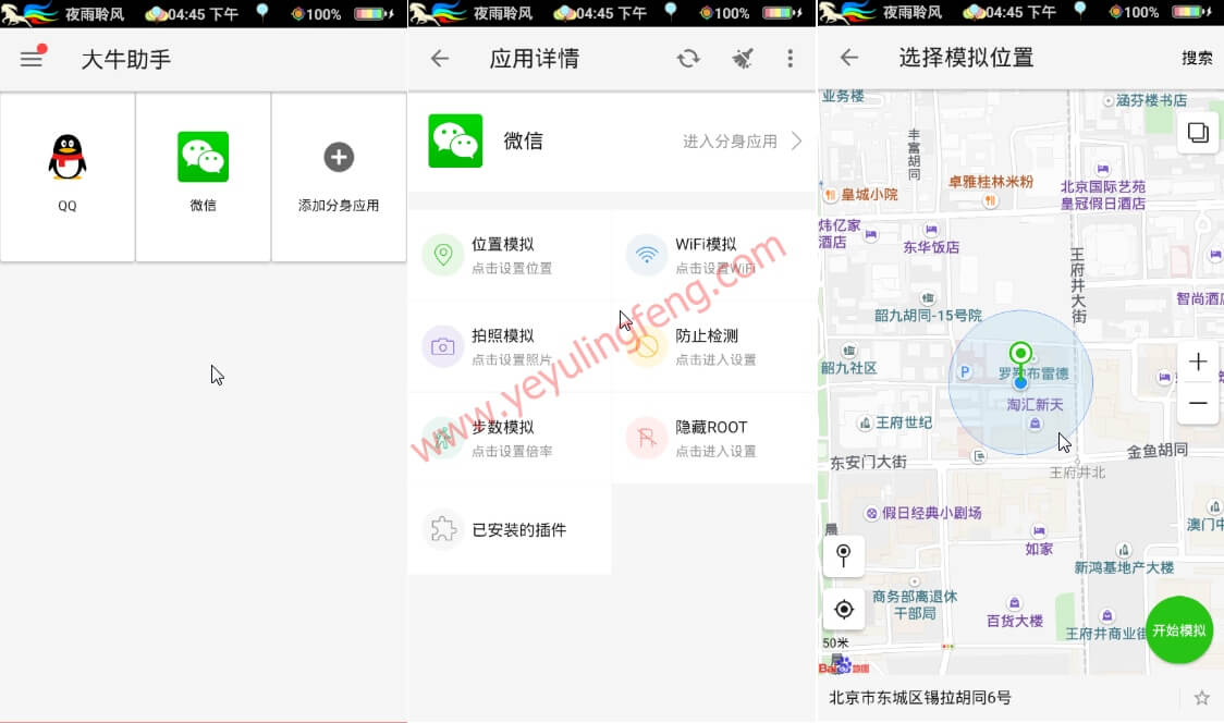 大牛助手相比一些虚拟定位工具来说拓展功能更加丰富,用户需要那些功能拓展只需要自行下载插件即可体验,非常的方便快捷!在此附上之前老夜在站内分享的其他虚拟定位工具安卓虚拟定位精灵 — 支持各种社交软件和天下任我行免root版都能实现位置自由设定模拟,资源已过多时至于有没有失效大家另测吧!如果只是需要贼朋友圈发发定位装一波13下面这款应该足够适用:
