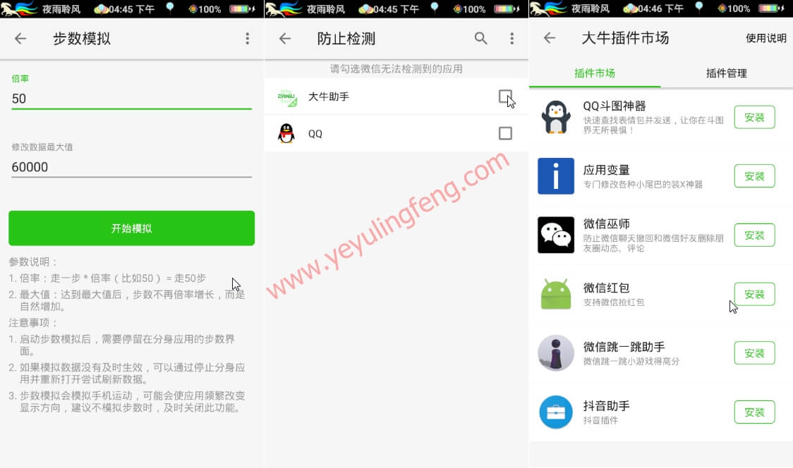 大牛助手是一个在免root环境下运行的APP,支持多开APP、数据模拟、安装插件,让您的手机功能得到扩展,增加更多功能体验。对于手机不能root且没有安装XP框架的用户来说,只需要在大牛助手内创建一个应用的分身就能在虚拟环境内模拟各种数据,且支持虚拟定位、运动刷步数、WiFi模拟、拍照模拟等,其他功能需要在插件中心下载安装使用,例如微信抢红包等插件都是完美支持的。为了反之正版软件检测运行环境,大牛助手还提供了更安全的防止检测功能,大大降低了账号异常风险的概率。可以用来微商做生意、刷朋友圈、考勤、签到等,对于虚拟定位滥用造成的损失由用户负责,请合理使用。