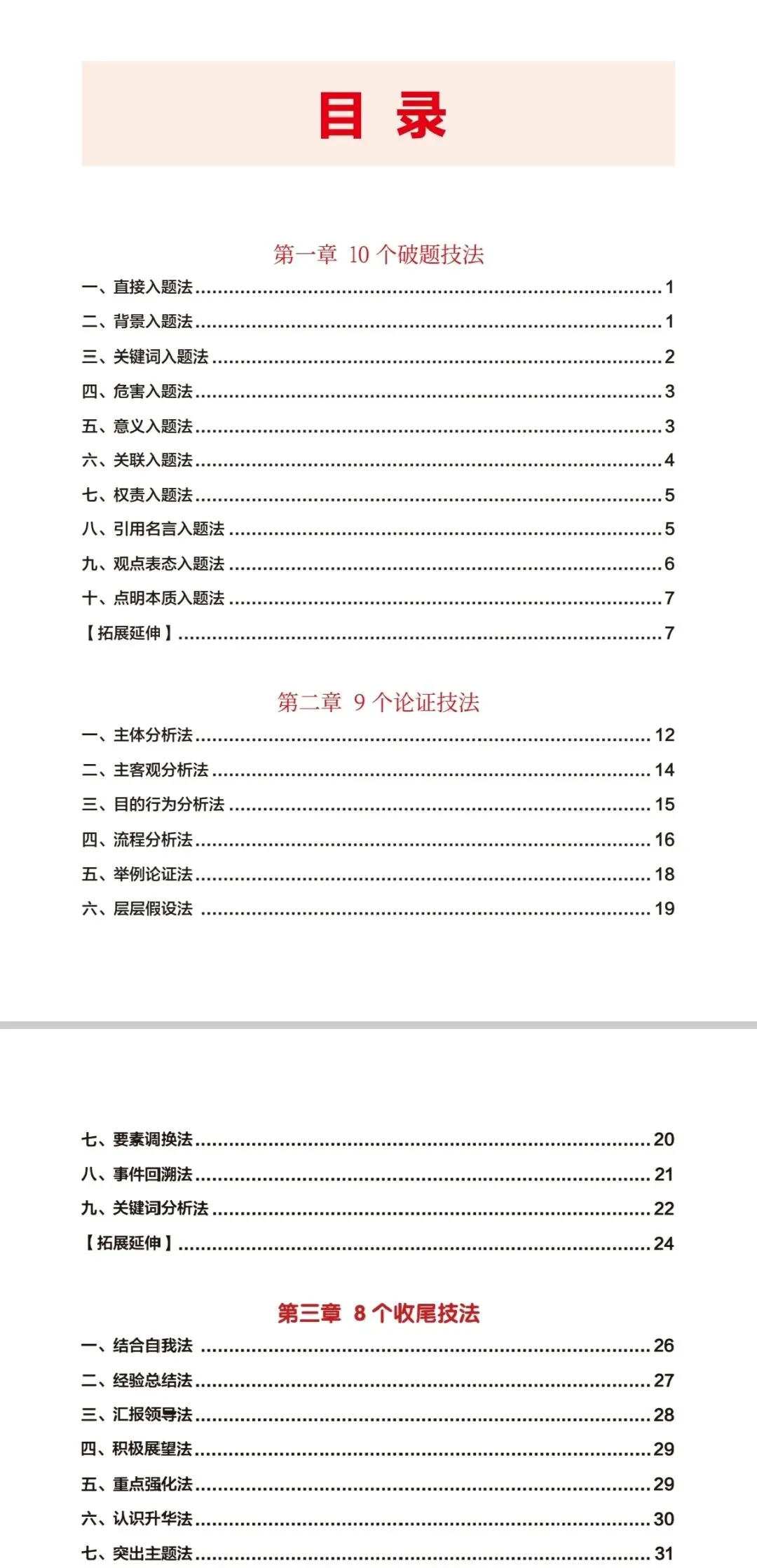 从 “开篇抓心” 到 “内核扎实” 再到 “收口点睛”,层层递进打造完整作答逻辑,每个技法均附星级推荐指数,精准把控学习重点,高效提升备考效率。