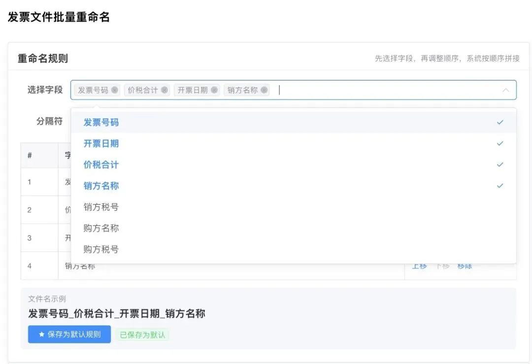 根据自己的需求,依次选择需要的命名字段(比如发票代码、发票号码、开票日期、金额等),挑选合适的分隔符(如“-”“_”),调整好命名顺序,一键确认即可。