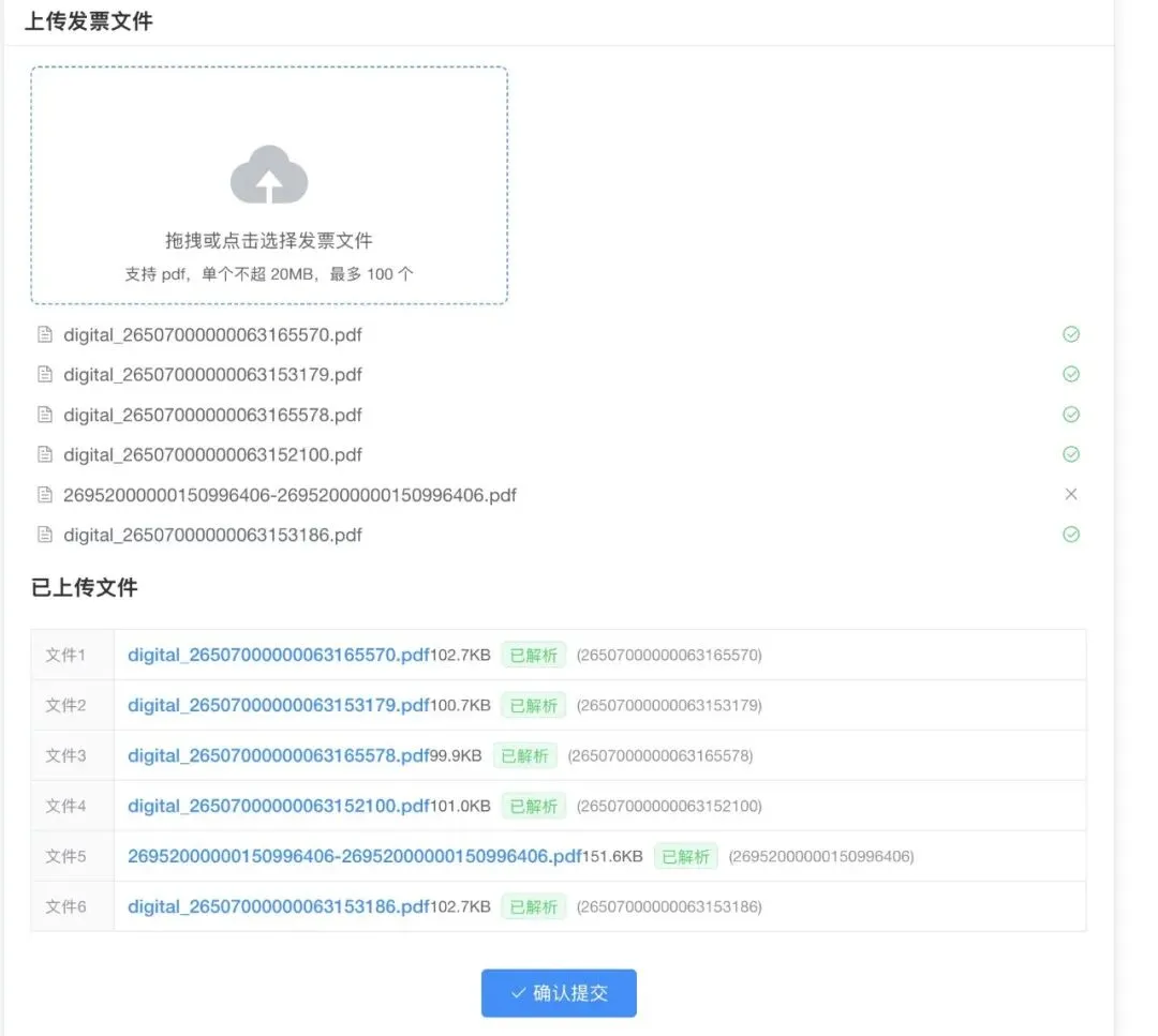点击上传按钮,选择需要重命名的pdf发票文件,最多支持一次性上传100个文件,不用分批操作,节省大量时间。