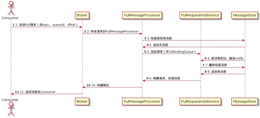 RocketMQ的长轮询核心逻辑集中在PullMessageProcessor(处理Pull请求)和PullRequestHoldService(管理挂起请求)两个类。我们从Pull请求的处理流程开始拆解:
