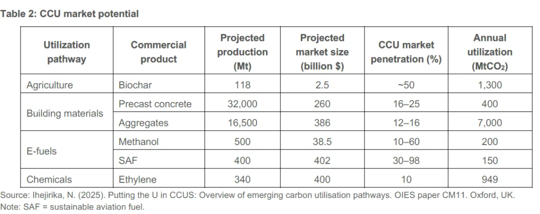 根据各种商业路径的年度利用潜力关键数据,如果将 CCU 定位为捕集大气碳的巨大“汇”,将得到: