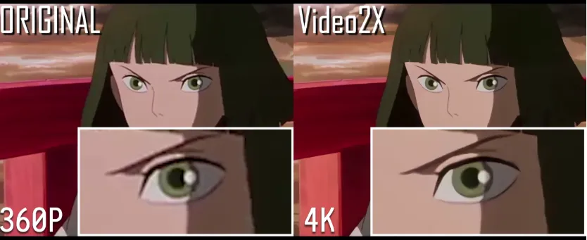 对这类内容,基于 AI 的逐帧增强通常比普通双三次插值要强太多。简单说,普通放大是把糊变大,Video2X 更像是试图把丢掉的细节重新补回来。
