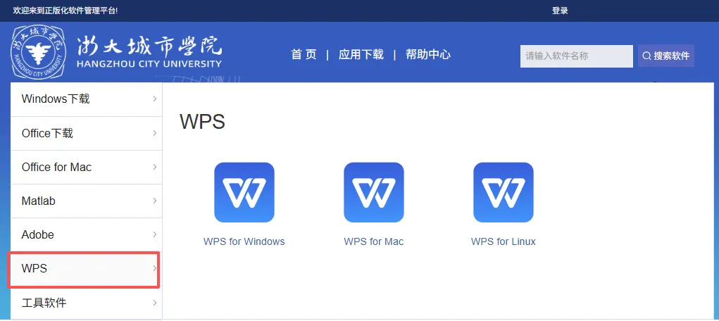 进入学校正版化软件管理和服务平台http://software.hzcu.edu.cn/(校外访问请连接VPN零信任vpn用户使用手册.pdf),选择WPS,下载对应的系统版本安装即可。