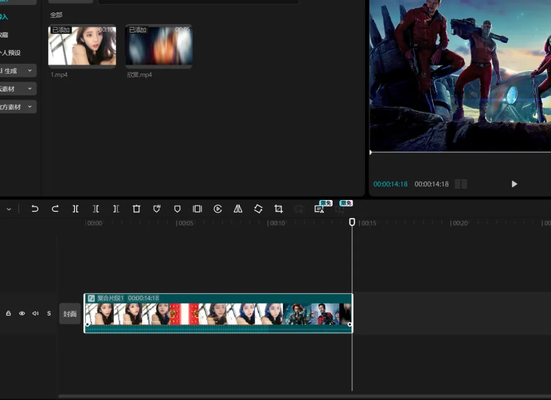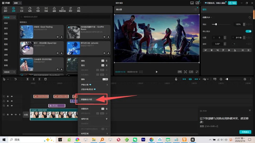我们先别急直接导出,Ctrl+A全选所有视频,然后鼠标右键新建复合片段