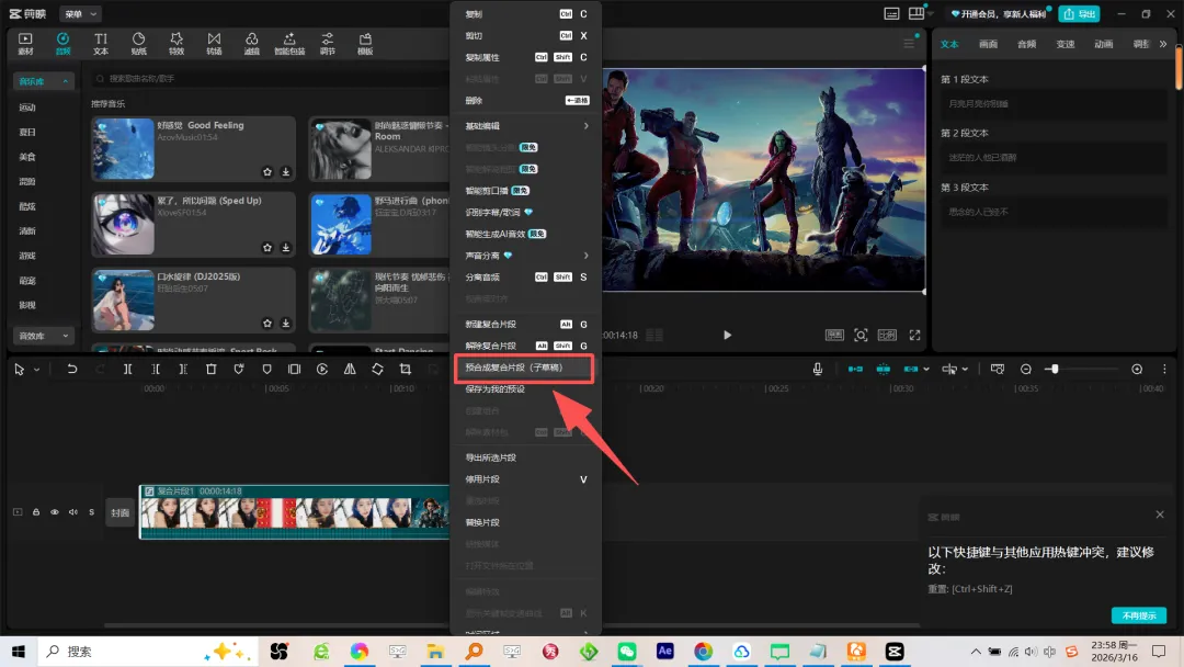 接着选中这个整体视频,在一次鼠标右键-预合成复合片段(子草稿)